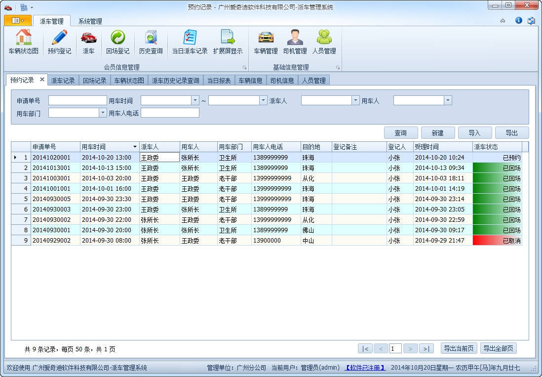 軟件包含預(yù)約、派車、回場(chǎng)等過程,綜合了對(duì)車輛、司機(jī)、使用人員、數(shù)據(jù)字典等綜合信息的管理,能夠方便實(shí)現(xiàn)車輛的派車調(diào)度處理,系統(tǒng)可以打印派車單、車輛統(tǒng)計(jì)等報(bào)表,以及支持把預(yù)約和派車信息顯示在幕墻或者擴(kuò)展屏幕上,非常方便操作和管理。