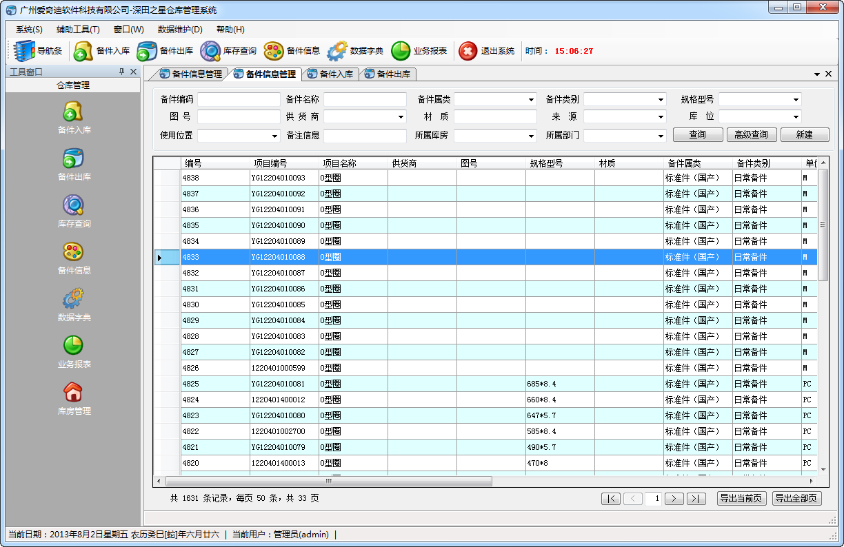 備件倉庫管理系統(tǒng),是一款界面友好,方便易用的倉庫管理系統(tǒng),集備件信息管理、備件入庫、備件出庫、庫存查詢、庫房管理、業(yè)務(wù)報(bào)表、權(quán)限管理、數(shù)據(jù)字典管理、備件及庫存導(dǎo)入等功能于一體。