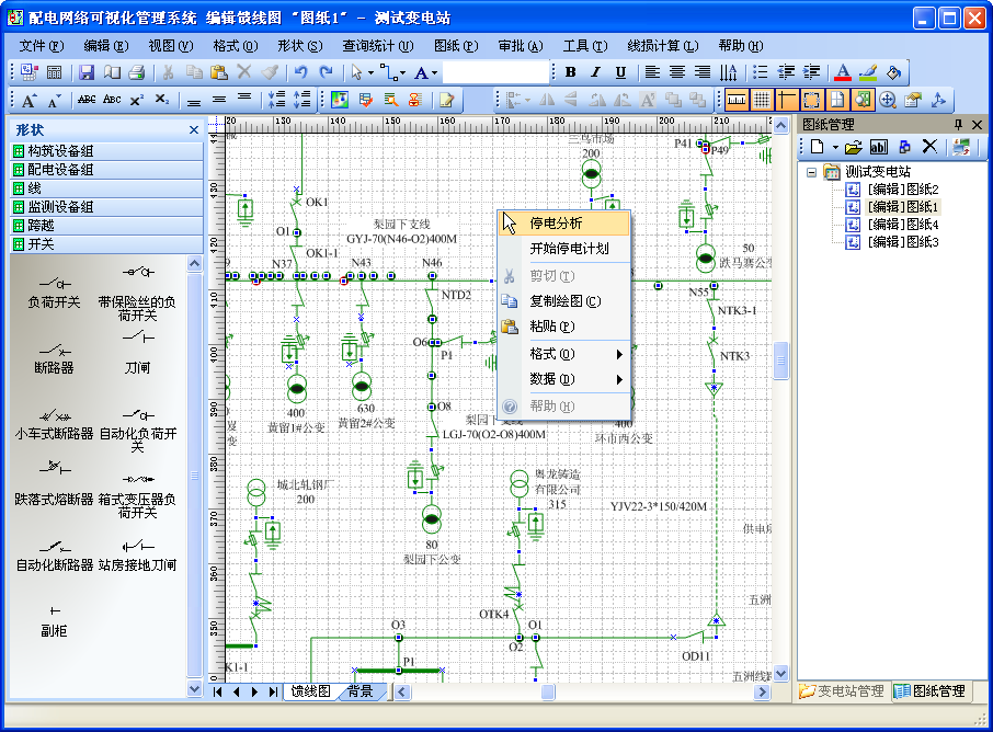 配電網(wǎng)絡(luò)管理可視化系統(tǒng),是按《電氣符號(hào)國家標(biāo)準(zhǔn)》提供統(tǒng)一的電網(wǎng)圖標(biāo)設(shè)計(jì),具有強(qiáng)大的繪圖功能、饋線圖管理功能、饋線圖的審批流程、在線修改饋線圖、實(shí)時(shí)查看饋線圖、設(shè)備與圖紙緊密結(jié)合、完整的資產(chǎn)管理與強(qiáng)大的資產(chǎn)信息查詢與統(tǒng)計(jì)功能、電力用戶信息管理、停電分析功能、線損計(jì)算功能等。