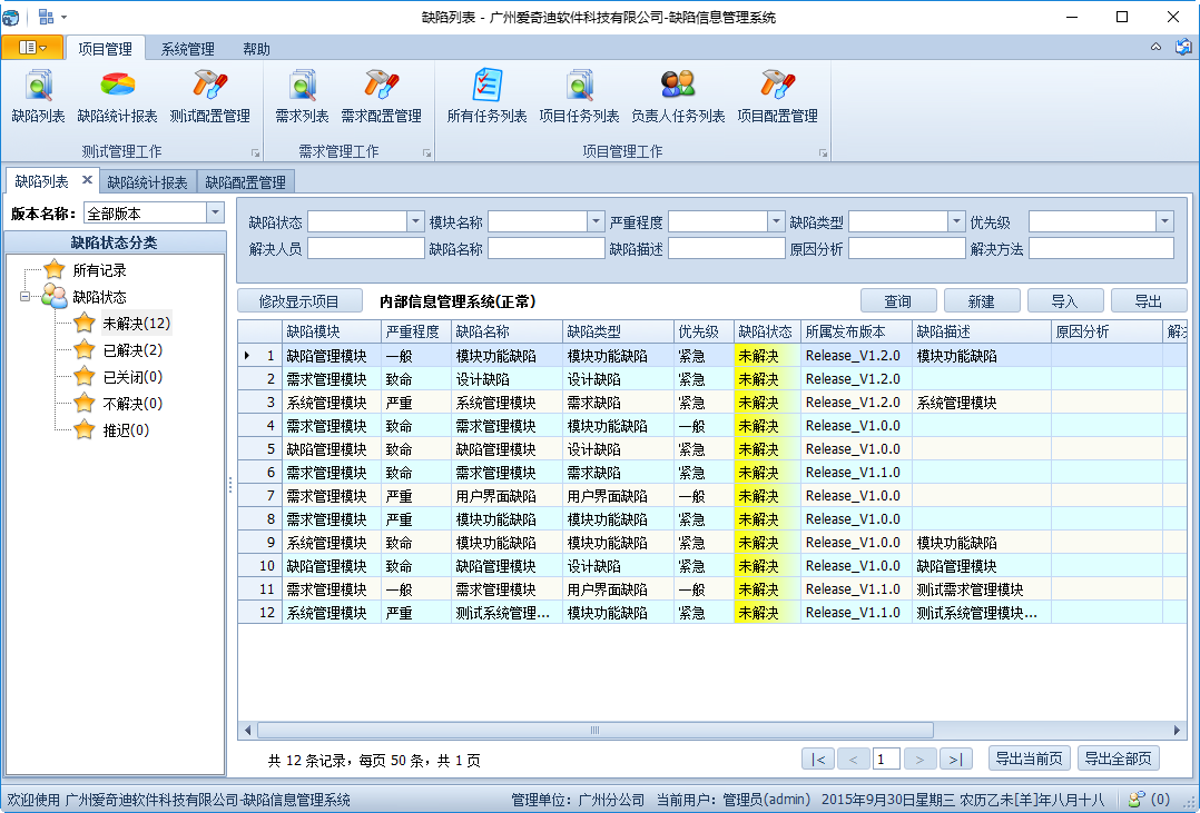 該軟件的功能包括:缺陷的維護(hù)管理(可上傳圖片)、項(xiàng)目列表維護(hù)、模塊列表維護(hù)、版本列表維護(hù)(數(shù)據(jù)字典維護(hù)(缺陷狀態(tài)、缺陷類型、緊急程度、優(yōu)先級(jí))、用戶及功能權(quán)限管理、機(jī)構(gòu)數(shù)據(jù)權(quán)限管理等功能。軟件能夠規(guī)范項(xiàng)目開發(fā)過程中的缺陷記錄跟蹤流程、能夠根據(jù)不同的角色和機(jī)構(gòu)分配不同的缺陷,極大提高項(xiàng)目開發(fā)及管理水平。軟件界面美觀大方,方便使用。